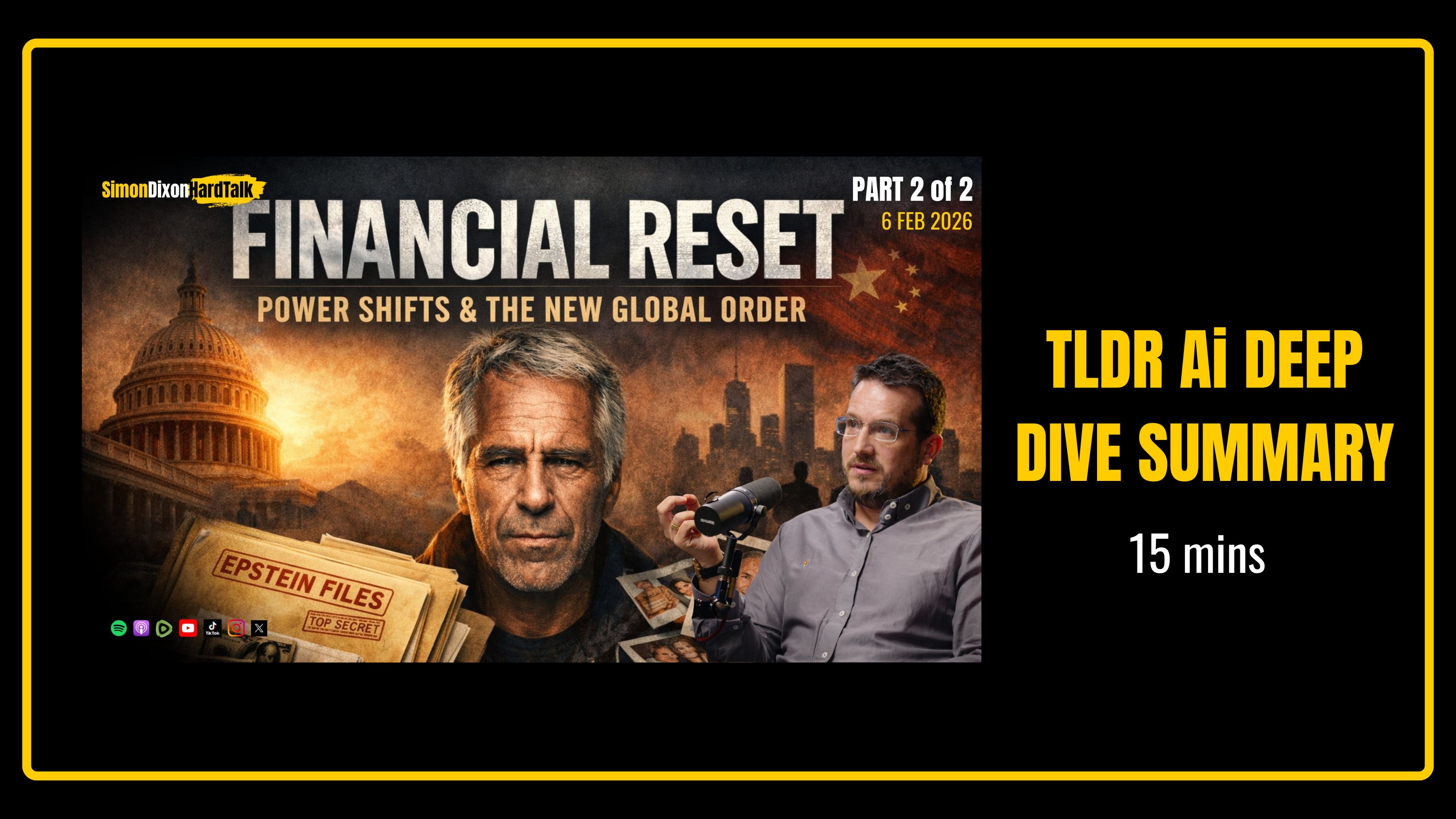The world is currently experiencing a "Financial Reset" hidden in plain sight. We aren't just watching a standard news cycle; we are witnessing the systematic dismantling of the old guard and the calculated birth of a multipolar world. The traditional pillars of power—the dollar, the debt, and the "Proof of Weapons" network (the old guard's reliance on military force to back the currency)—are being restructured by the very people who managed them. This blog post is the synthesized "TLDR" of the Part 2 segment (approximately 1 hour and 25 minutes) of the SimonDixonHardTalk livestream that aired on February 6th, 2026. For those who want the full deep dive into how we got here, the complete 3-hour and 14-minute livestream, titled "The Epstein Files Marked the Global Financial Reset | SimonDixonHardTalk LIVE," is available on my YouTube, X, and Rumble channels.