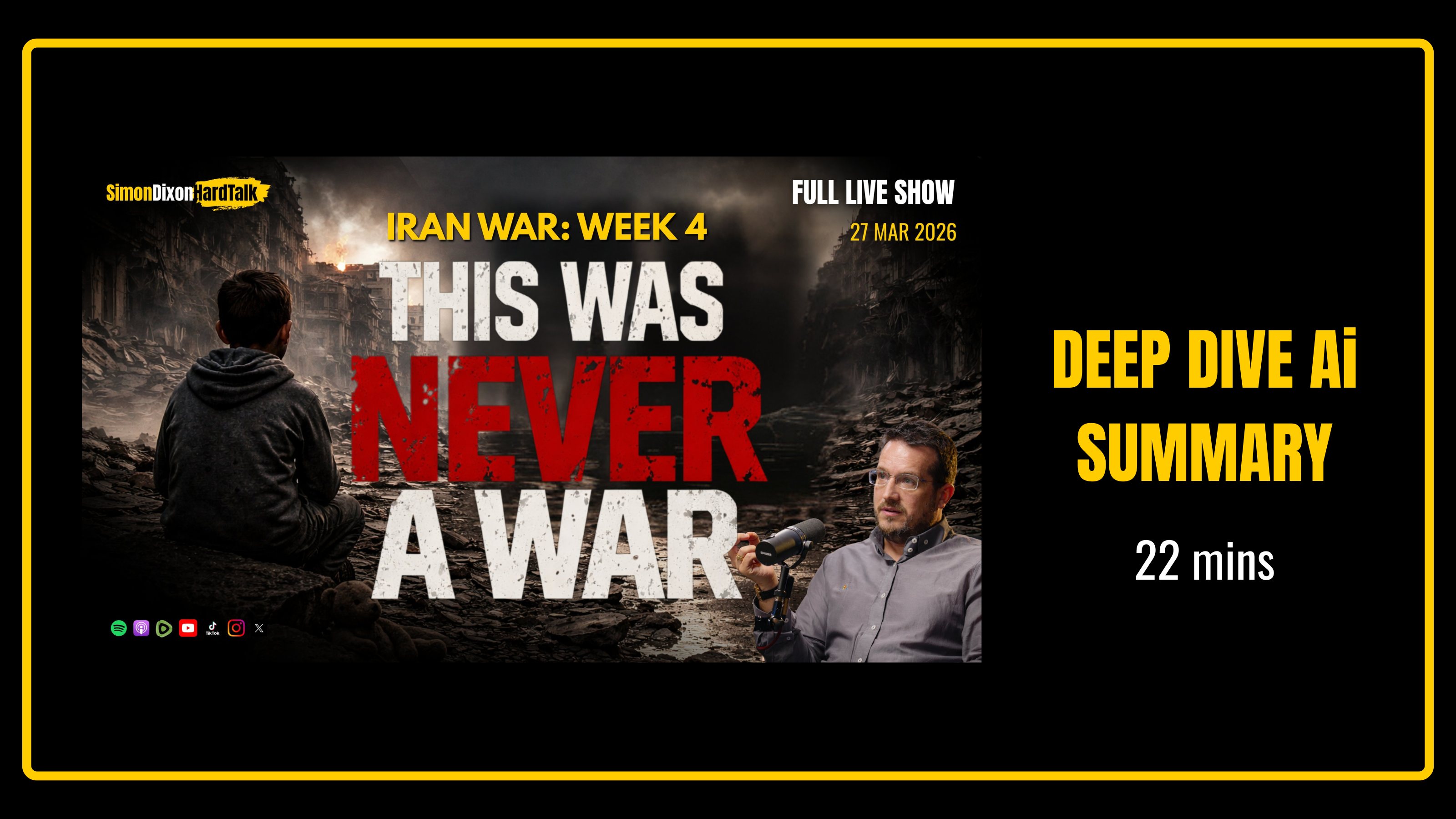 We are now four weeks into the most significant structural realignment of our lifetime. This briefing decodes the strategic architecture of "🇮🇷🇺🇸🇮🇱 Iran War Week 4: Build Back Better | The Next Phase of the Global Reset," a deep-dive analysis originally delivered in our SimonDixonHardTalk LIVE session on the 27th of March 2026. Over the course of 3 hours and 46 minutes, we dissected the transition from the kinetic "Shock Phase" of Week 1 to the technocratic "Build Back Better" phase we find ourselves in now. We must break this reset into two core vectors: the kinetic transition in West Asia and the structural shift in the New World Order, as explored in my extensive interview with Professor Dave Collum and BTC Sessions.