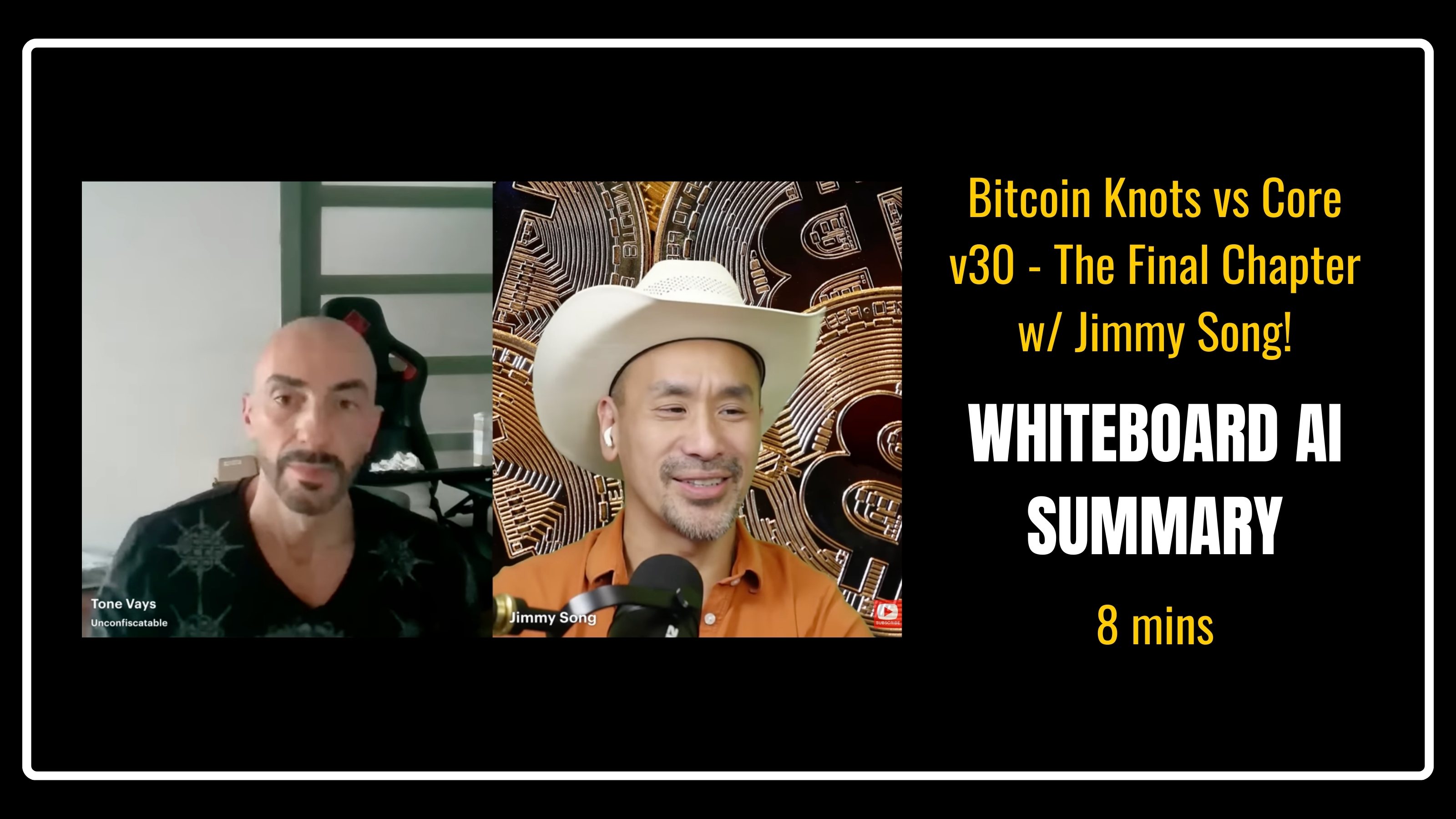 Ai generated whiteboard video explainer of a 3 hour 53 mins video between Tone Vays and Jimmy Song: Bitcoin Knots vs Core v30 - The Final Chapter